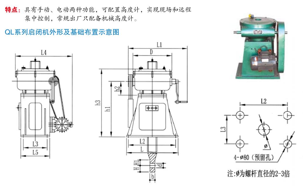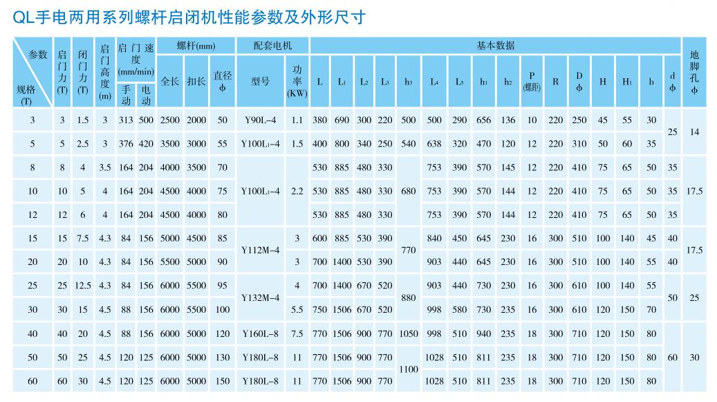 QL螺桿啟閉機(jī)系列啟閉機(jī)按吊點(diǎn)數(shù)分為單吊點(diǎn)和雙吊點(diǎn)兩種型號(hào),按驅(qū)動(dòng)方式分為手動(dòng)、電動(dòng)和手電兩用三種形式,一般啟閉容量超過(guò)60噸(單機(jī))時(shí)不再配置手動(dòng)機(jī)構(gòu)。水工機(jī)械廠生產(chǎn)的QL型系列啟閉機(jī)啟門為3KN-650KN,超過(guò)650KN(單機(jī))時(shí)可特殊設(shè)計(jì)。